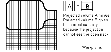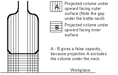 Une bouteille est un bon exemple de comment la projection peut affecter les résultats. Quand elle est debout au-dessus de plan de travail, le volume sous la surface externe faisant face vers le haut n'inclut pas le goulot. Quand le volume sous la surface interne faisant face vers le haut est soustrait de celle-ci, le résultat n'est pas la capacité de la bouteille.