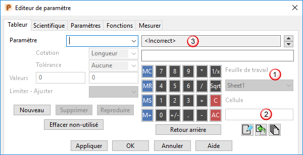 Synchroniser les paramètres avec le tableur — Ceci synchronise PowerShape avec le tableur Excel pour mettre à jour toutes les valeurs quand des changements ont été effectués. Sélectionnez cette option à chaque fois que vous éditez le tableur.