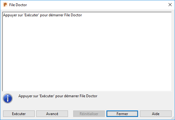- Avancé — Passe à la version avancée de File Doctor et affiche la boite de dialogue File Doctor (mode avancé). Ce mode donne un contrôle complet sur les vérifications et les réparations effectuées par File Doctor. Seuls les utilisateurs expérimentés devraient utiliser cette option.