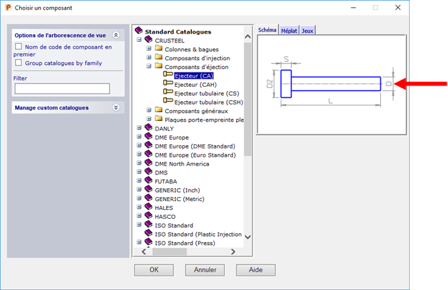 — Sélectionnez un catalogue pour afficher la liste des composants. Sélectionnez le composant que vous voulez créer. 1 L'image du composant est affichée dans la boite de dialogue :