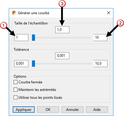 Remarque : Les points dans le nuage sont supposés être 'en ordre', si le nuage a été importé, le premier point est le départ de la courbe et le dernier point est la fin de la courbe.