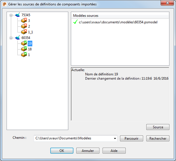 Modèles source — L'arborescence montre la liste des modèles source, avec leur définitions de composant importées associées. Les icônes sur la gauche représentent la définition importée et celles sur la droite représentent la définition dans le modèle source. Si le lien entre celles-ci est rompu (par exemple, si la définition de composant dans le modèle source a été renommée ou effacée), l'icône est changée pour indiquer le problème