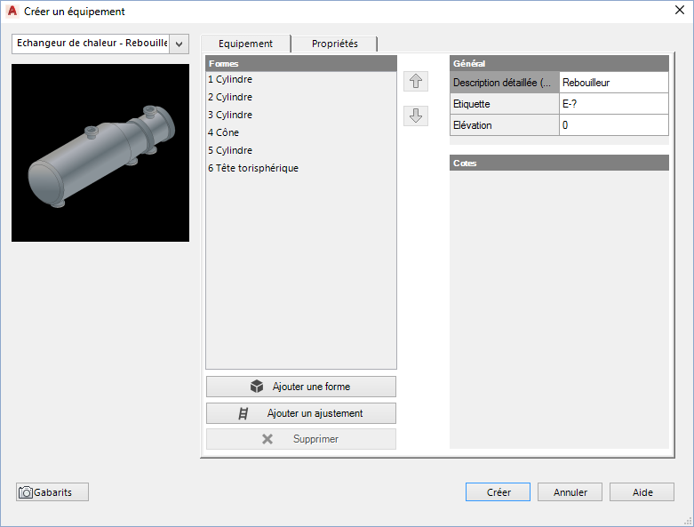 Pour certains types d'équipements, affiche la liste des formes que vous pouvez empiler pour créer un équipement. Vous pouvez également ajouter des formes pour créer un équipement personnalisé.
