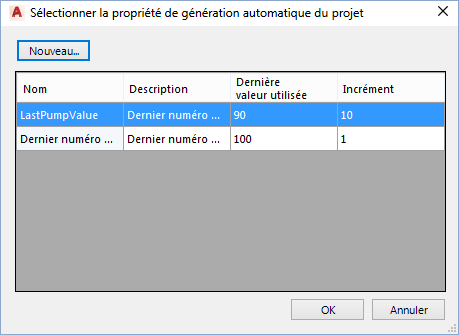 - Dans la boîte de dialogue Sélectionner la propriété de génération automatique du projet, cliquez sur Nouveau.