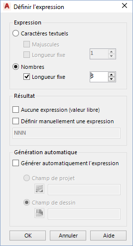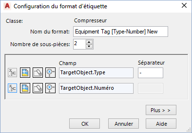 Conseil : Utilisez autant de propriétés que nécessaire comme sous-pièces. Utilisez des séparateurs uniquement entre ces sous-pièces, pas à l'intérieur de celles-ci. Des séparateurs apparaissent entre les sous-pièces d'une étiquette si vous les spécifiez dans la zone Séparateur. Si vous entrez un tiret entre des éléments de la zone Champ (p. ex. N-N-N), les résultats obtenus peuvent être inattendus.