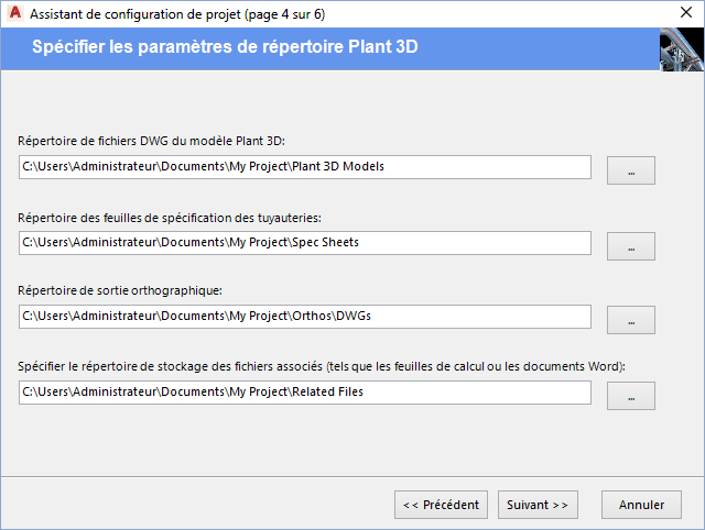 Indique les emplacements de dossiers pour les modèles Plant 3D, les feuilles de spécification des tuyauteries et les dessins orthographiques.