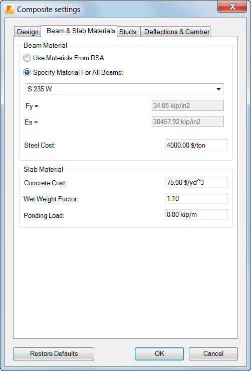Beam and slab materials - settings: