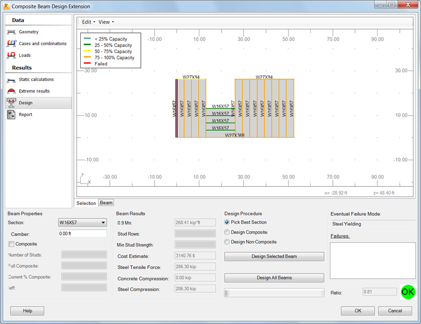 Design Selected Beam. It automatically selects the optimum section, number of studs, and camber for the beam selected in the graphic viewer.