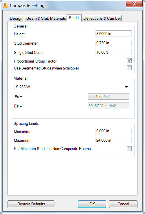 Specifies steel used for studs, steel strength (Fu) and Young's modulus (Es). You can select: