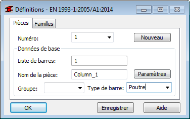 - Dans la boîte de dialogue Définitions, remplacez le numéro par 2, le nom de la pièce par Poteau_2 et le type de barre par Poteau. Cliquez sur Enregistrer. Les poutres doivent également être modifiées, mais la définition du type de barre Poutre standard n'est pas adaptée à cette situation.
