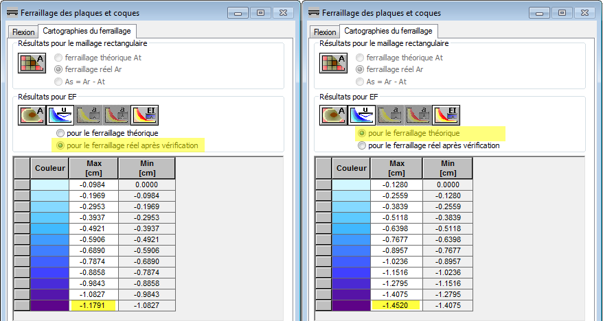 - Utilisez les options pour le ferraillage réel après la vérification et pour le ferraillage théorique pour comparer les flèches avant et après la vérification.