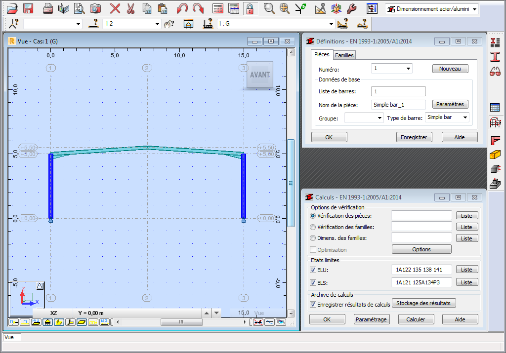 - La présentation de l'écran est réinitialisée (comme illustré ci-dessous) et affiche les boîtes de dialogue Définitions et Calculs associées à la norme sélectionnée. Une fois ces dernières ouvertes, le reste du processus de vérification est relativement simple.