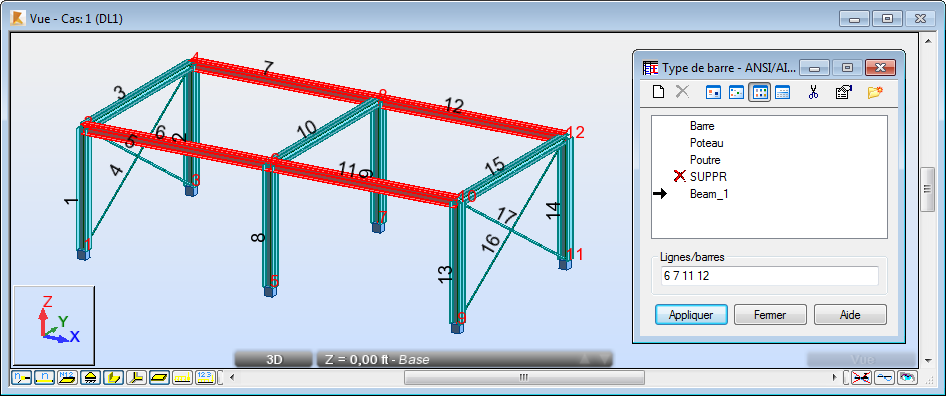 Vous pouvez également placer le curseur dans le champ Lignes/barres, puis accéder à la zone de dessin et, tout en maintenant la touche Ctrl enfoncée, sélectionner les poutres avec les numéros 6, 7, 11 et 12.