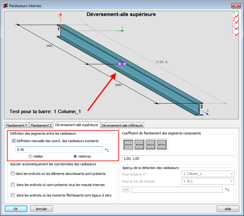 - Dans le groupe Définition des segments entre les raidisseurs de l'onglet Déversement-aile supérieure, sélectionnez Définition manuelle des coord. des raidisseurs existants et tapez 0.5.