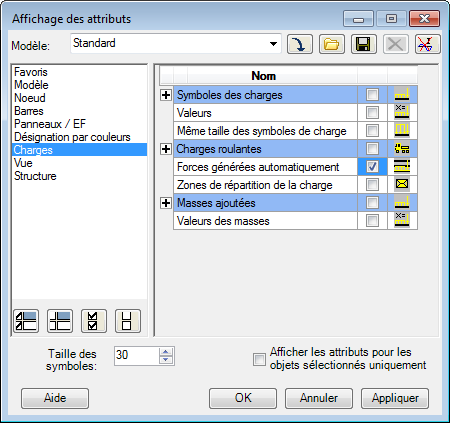 - Dans la boîte de dialogue Affichage des attributs, sélectionnez Charges, puis Forces générées automatiquement, comme indiqué ci-dessous. Cliquez sur OK.