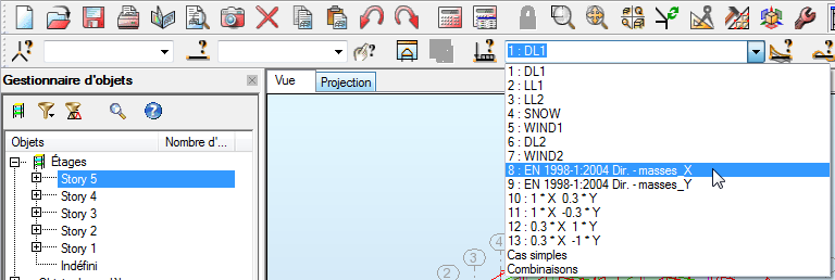 - Les charges PERM1 par défaut s'affichent. Pour afficher la charge sismique, développez la liste déroulante Cas de charge et sélectionnez EN 1998-1:2004 Direction X, comme illustré ci-dessous.