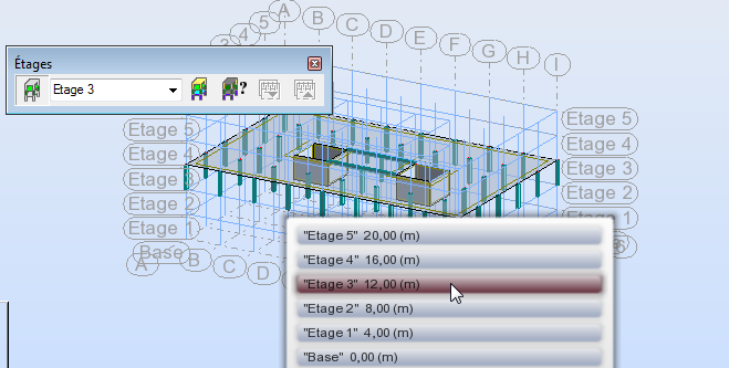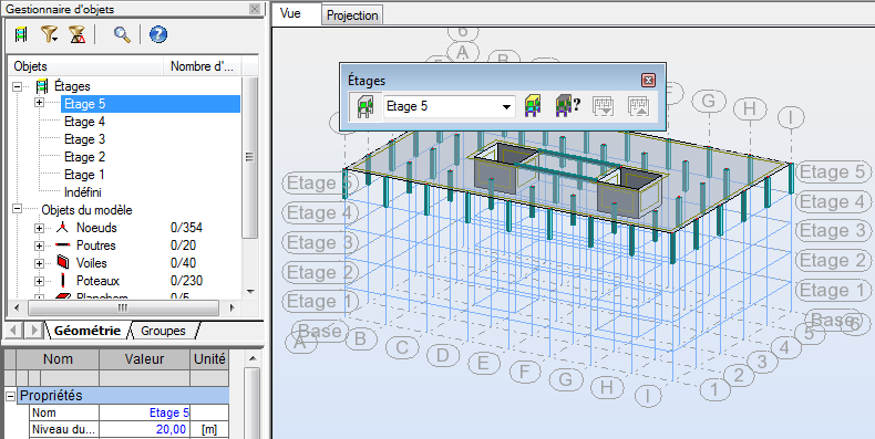 (Projection 3D XYZ) pour revenir à la vue 3D. Les poteaux et les murs de l'étage 5 sont sélectionnés.