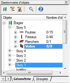 - Pour effacer les murs sans supprimer les poteaux, dans le Gestionnaire d’objets, développez Etage 5 pour afficher les types d'éléments utilisés et sélectionnés, comme illustré ci-dessous.