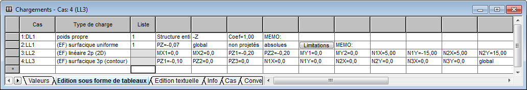 Conseil : Vous pouvez utiliser le tableau des charges afin de modifier les charges définies. Par exemple, vous pouvez modifier les types de charges, la liste des éléments pour lesquels les charges sont appliquées et les valeurs de ces charges. Vous pouvez également utiliser ce tableau pour ajouter des charges à la structure.