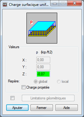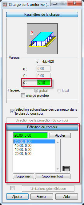 - Accédez à la boîte de dialogue Définition des charges, puis dans l'onglet Surface, cliquez sur
