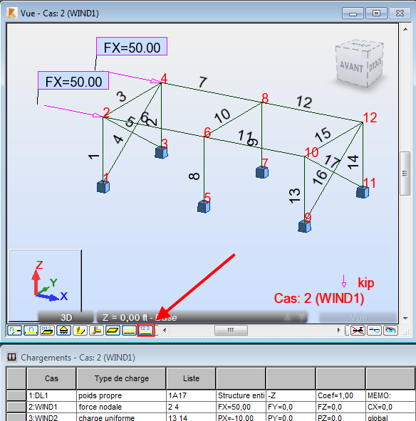 La charge WIND2 s'affiche dans la zone de dessin et dans le tableau des cas de charges.