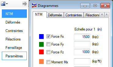 - Dans la boîte de dialogue Diagrammes, vous pouvez spécifier les informations que vous souhaitez afficher, y compris les efforts internes (NTM), la déformation, les contraintes, les réactions, et les armatures.