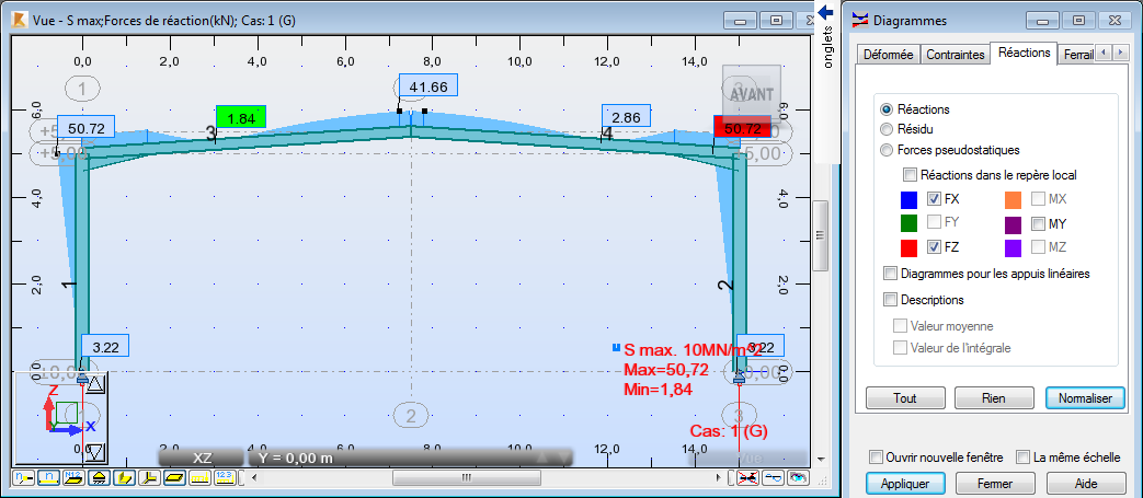 - Plusieurs tableaux peuvent être appliqués à une vue. Ouvrez l'onglet Contraintes, sélectionnez Maximales– S max et cliquez sur Appliquer. Les efforts précédemment sélectionnés et les contraintes s'affichent.