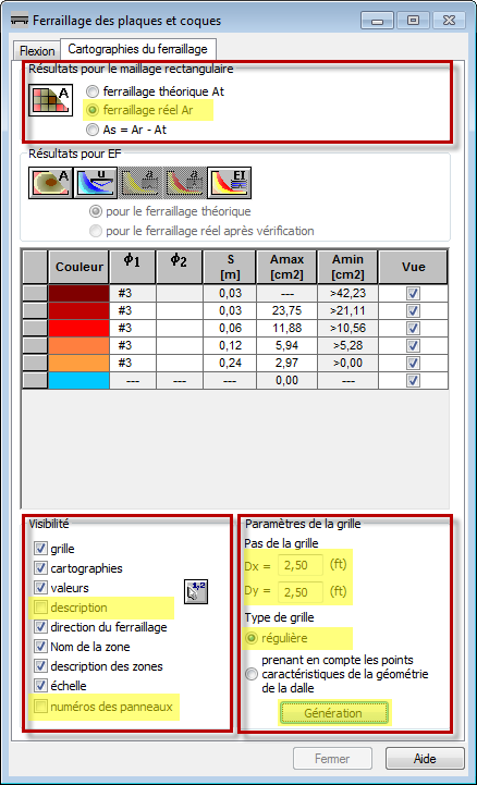La présentation Dalle - ferraillage réel s'ouvre. La présentation est divisée en deux parties : la vue Dalle - cartographie du ferraillage et la boîte de dialogue Ferraillage des plaques et coques.