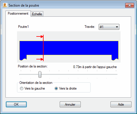 L'onglet Section de la poutre de la boîte de dialogue Position de la section vous permet de sélectionner la section transversale et la travée d'une poutre représentée dans le plan d'exécution.