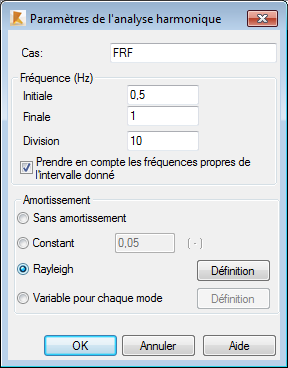 La boîte de dialogue Paramètres de l'analyse harmonique (FRF) sert à définir les paramètres de l'analyse des vibrations harmoniques dans le domaine de fréquence (FRF) pour un cas de charge.