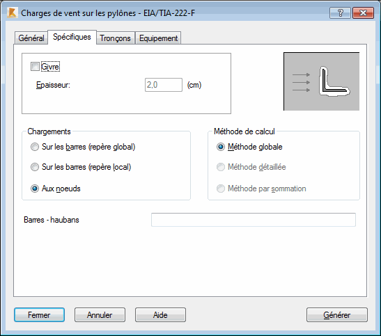 Après la sélection de l'onglet Spécifiques, la boîte de dialogue Charges de vent sur les pylônes prend l'aspect représenté ci-dessous.