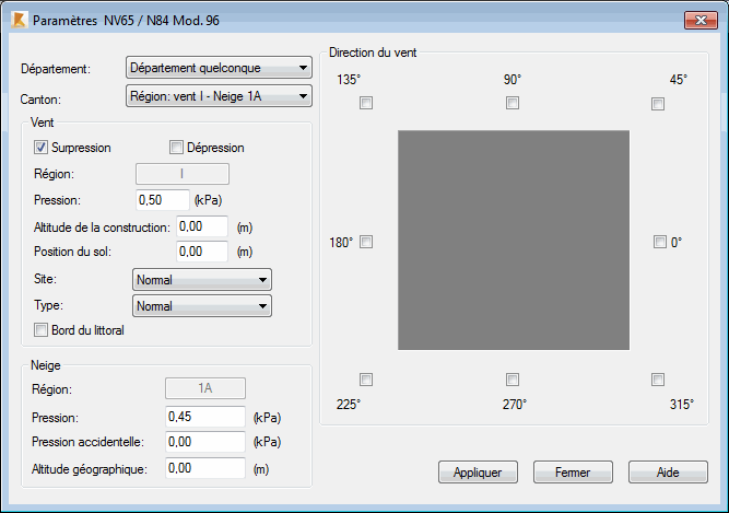 Après un clic sur le bouton Appliquer, le logiciel ferme cette boîte de dialogue et ouvre la boîte de dialogue Charges qui contient le tableau avec les coefficients et les charges climatiques résultantes.