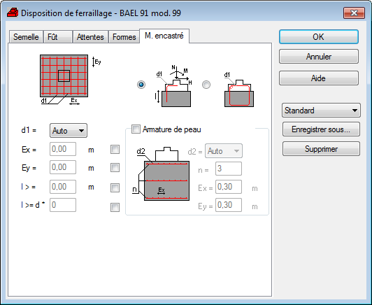Si l'option Massif encastré est sélectionnée dans la boîte de dialogue Définition des dimensions (onglet Gros béton/Massif encastré), la boîte de dialogue Disposition d'armature contient les options permettant de déterminer les paramètres des armatures unissant la semelle au massif encastré.