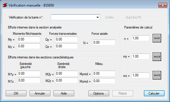 La boîte de dialogue Vérification manuelle sert à effectuer la vérification manuelle de la barre acier pour les valeurs des efforts internes définies par l’utilisateur, la vérification est effectuée selon la norme acier britannique BS 5950. Accédez à l'option en cliquant sur Dimensionnement Dimensionnement des barres en acier - options Vérification. Le logiciel affiche la boîte de dialogue ci-dessous :