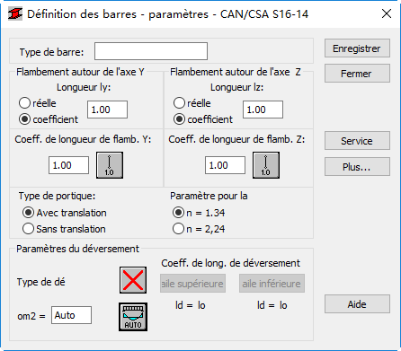 La zone Coeff. de longueur de flamb. (Y ou Z) permet de définir les coefficients de longueur de flambement de la barre dans les deux directions. Le logiciel propose automatiquement la longueur réelle de la barre (ou, éventuellement, la longueur totale des barres composantes).