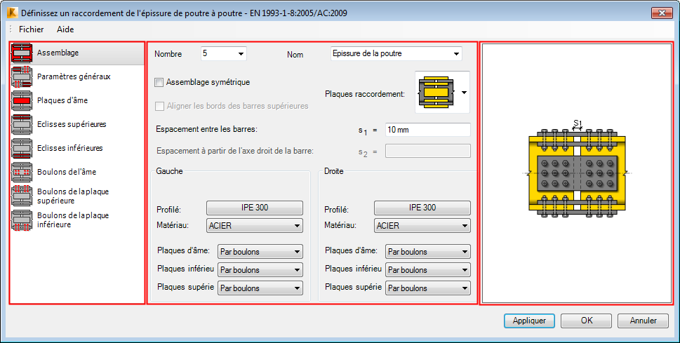 • Les sections Boulons de l'âme et Boulons des éclisses permettent de définir les paramètres des boulons de l'assemblage.