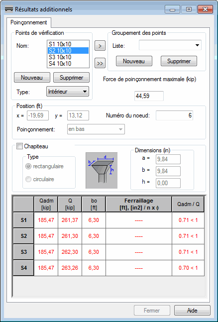 Dans le tableau contenant les résultats de l'analyse du poinçonnement pour chaque point de vérification, vous pouvez trouver les valeurs suivantes:
