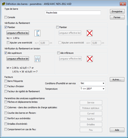 Utilisez cette boîte de dialogue pour définir les paramètres réglementaires d'une barre conformément à la norme ANSI/AWC NDS 2012, en mode ASD aussi bien qu'en mode LRFD.
