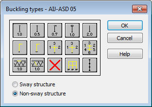 Le coefficient de longueur de flambement est saisi de façon automatique après la sélection d’une icône représentant les conditions d’appui aux extrémités de la barre. Les icônes sont divisées en deux groupes : le premier contient les méthodes standard (réglementaires) d'appui des barres et les valeurs de coefficient de flambement, tandis que l'autre contient des icônes permettant de calculer le coefficient de flambement des poteaux de portiques à plusieurs étages (calcul du coefficient de longueur de flambement pour 1, 3 et six barres aboutissantes). Un double-clic sur l'une des icônes représentant le calcul du coefficient de longueur de flambement (, , ) entraîne l’ouverture d’une boîte de dialogue supplémentaire.