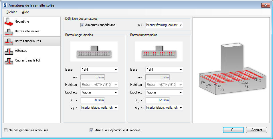 Pour générer l'armature supérieure d'une semelle, choisissez Armatures sup. sous Armatures-définition. Vous pouvez ensuite définir les paramètres de l'armature supérieure :
