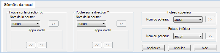 Pour les poutres BA, vous pouvez définir les noms des appuis nodaux. Les noms sont cohérents avec ceux des appuis des poutres dans le module Poutres BA. Après la saisie de tous les éléments, cliquez sur le bouton Appliquer. Le modèle du nœud s’affiche à l’écran.