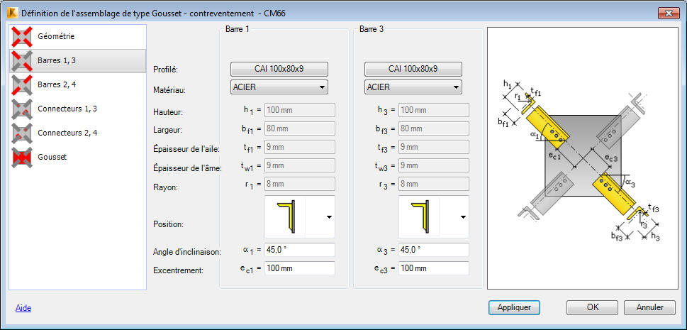 L'onglet Barres 1, 3 comprend les options permettant de définir les principaux paramètres des barres aboutissant au gousset qui se trouvent sur les lignes 1 et 3 :