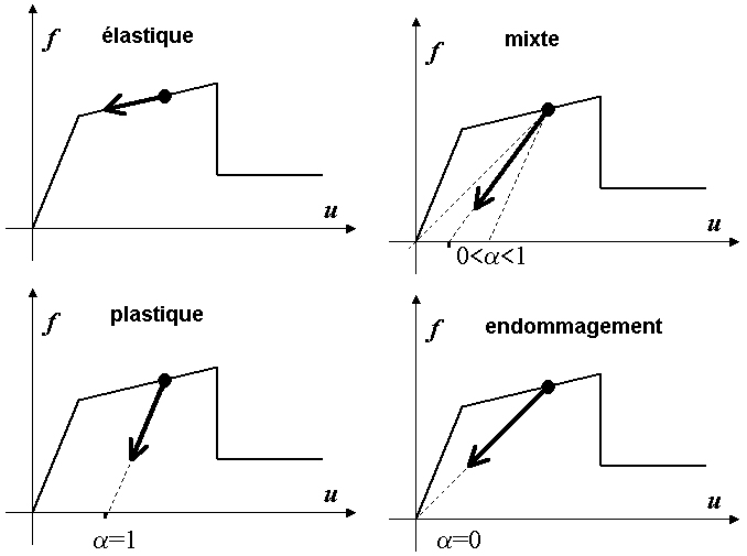 Vous devez également définir le mode de déchargement. Il définit le comportement du matériau après le dépassement du point de plasticité lors du déchargement, quand les déformations diminuent (gradient de déformations négatif). Il existe quatre types de comportement de matière (voir l'image ci-dessous) :