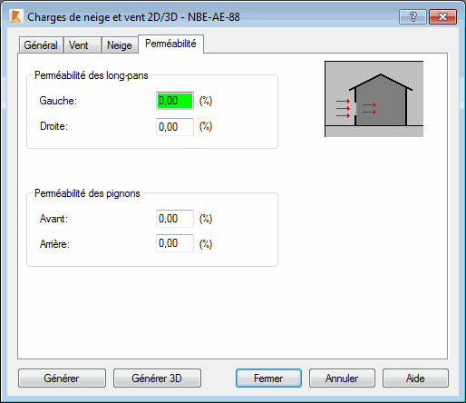 Lorsque vous ouvrez la boîte de dialogue Charges de neige et vent et cliquez sur l'onglet Perméabilité, la boîte de dialogue suivante s'affiche.