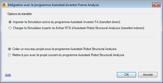- Importer la Simulation active du programme Autodesk Inventor FA (transfert direct) : crée le modèle de calcul directement dans le programme Robot à partir de la Simulation courante dans le module FA. L'option n'est pas accessible si le programme Autodesk Inventor n'est pas installé.