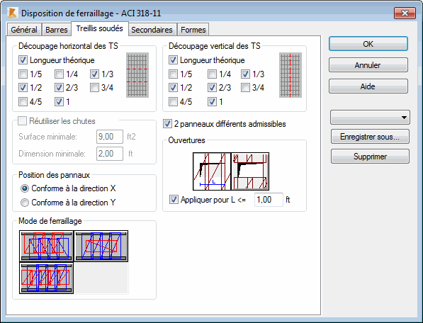 Après l’activation de la boîte de dialogue Disposition d'armature et la sélection de l’onglet Treillis soudés, la boîte de dialogue ci-dessous s’affiche à l’écran :