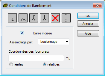 Le coefficient de longueur de flambement est saisi de façon automatique après la sélection d’une icône représentant les conditions d’appui aux extrémités de la barre. Pour supprimer tout effet de flambement des calculs, cliquez sur . Le flambement sera ainsi ignoré dans les calculs.