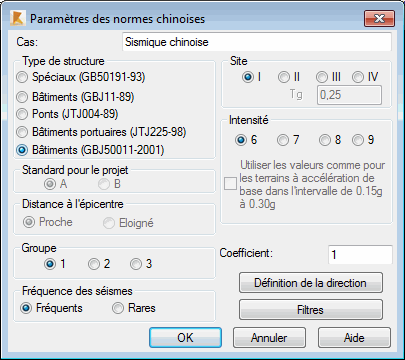 Les paramètres de l’analyse sismique des structures dépendent de la norme parasismique sélectionnée pour le calcul des structures sollicitées par des charges sismiques. Sélectionnez la norme sismique chinoise dans la boîte de dialogueDéfinir un nouveau cas ou cliquez sur Paramètres, dans la boîte de dialogue Type d'analyse.