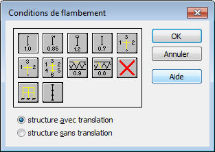 Le coefficient de longueur de flambement est saisi de façon automatique après la sélection d’une icône représentant les conditions d’appui aux extrémités de la barre. Les icônes sont divisées en deux groupes : le premier contient les méthodes par défaut (réglementaires) d’appui des barres et les valeurs de coefficient de flambement correspondantes, tandis que l’autre contient des icônes permettant de calculer le coefficient de flambement des poteaux des portiques à plusieurs étages (calcul du coefficient de longueur du flambement pour 1, 3 et 6 barres adjacentes).