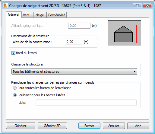 Après l’ouverture de la boîte de dialogue Charge de neige et vent et après un clic sur l’onglet Paramètres généraux, le logiciel affiche la boîte de dialogue suivante :
